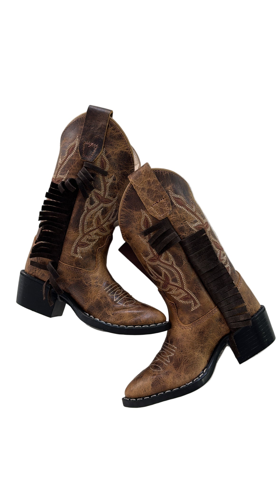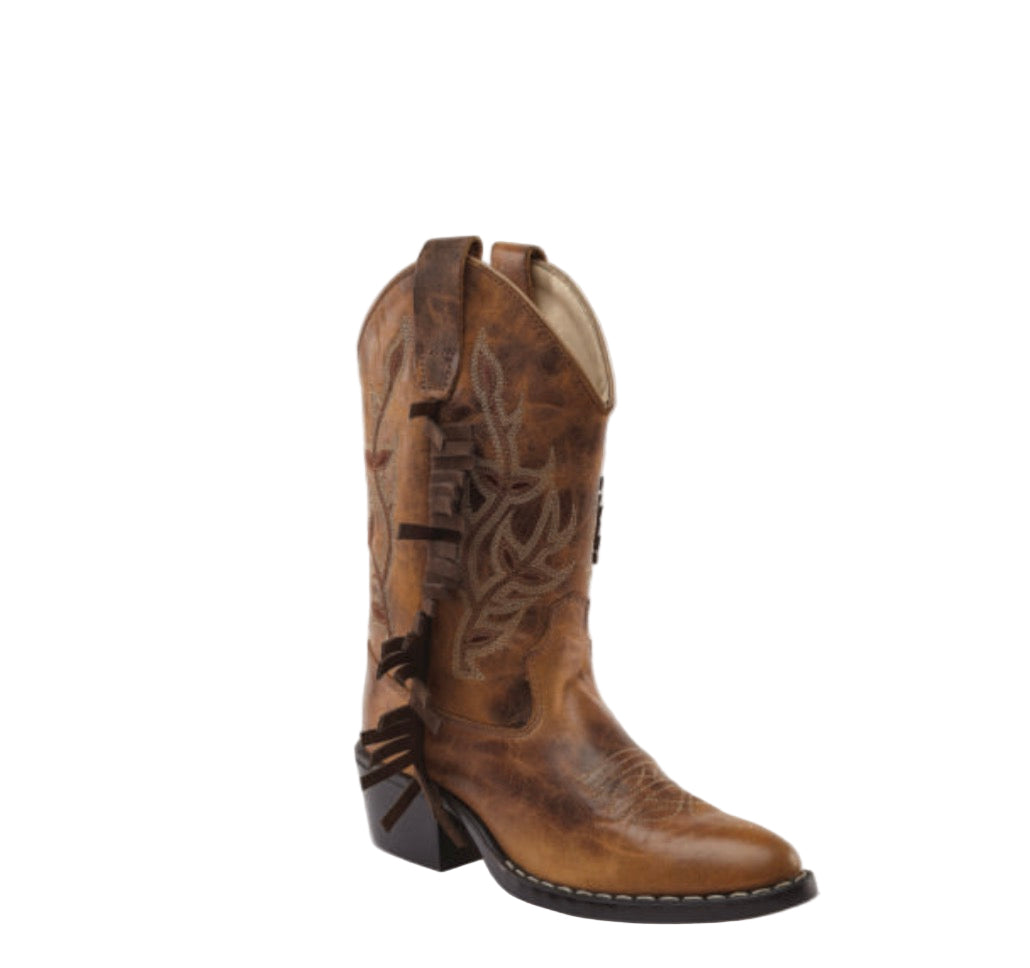 Crafted for little outlaws and trailblazers, this mid-calf western boot is the ultimate blend of heritage and attitude. Made from rich brown leather and adorned with the coolest embroidery, every stitch tells a story of adventure. A sturdy heel and classic pull tabs make it easy to slip on, whether they're riding into the sunset or just ruling the playground. Designed for comfort, built for legends—because every kid deserves a boot with a little swagger.